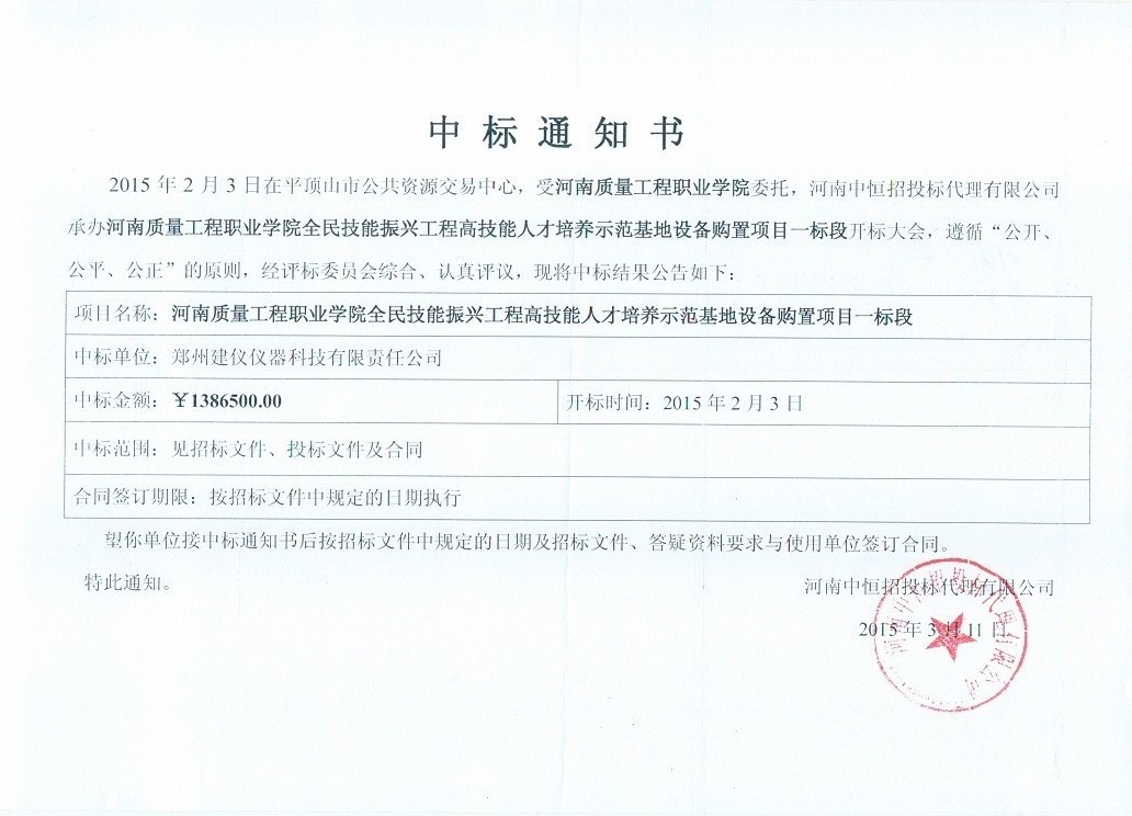 河南質(zhì)量工程職業(yè)技術(shù)學(xué)院PZC2014-9588Ag-46236(一標(biāo)段)中標(biāo)通知書