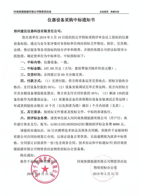 焦作千業(yè)新材料儀器設(shè)備中標(biāo)通知書(shū)