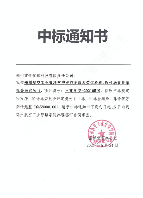 鄭州航空工業(yè)管理學(xué)院電液伺服疲勞試驗(yàn)機(jī)、改性瀝青顯微鏡等采購(gòu)項(xiàng)目