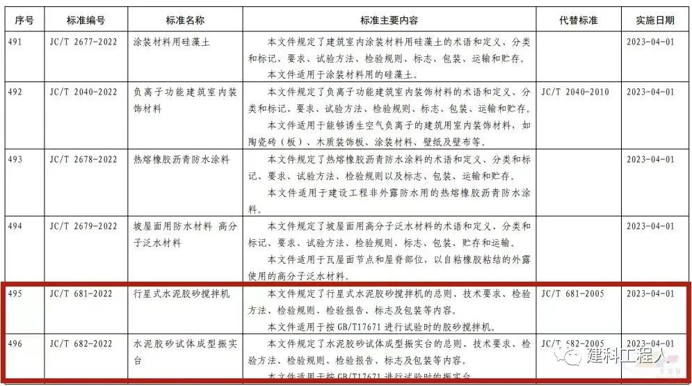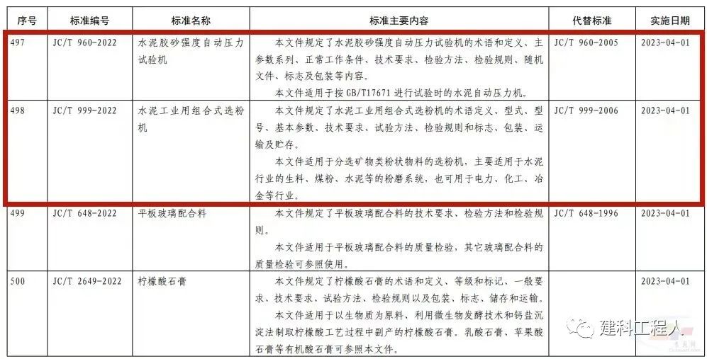 2022年10月20日,中華人民共和國工業(yè)和信息化部2022年第23號公告文件批準(zhǔn)發(fā)布1036項(xiàng)行業(yè)標(biāo)準(zhǔn),其中包含三項(xiàng)水泥膠砂強(qiáng)度檢驗(yàn)試驗(yàn)相關(guān)設(shè)備標(biāo)準(zhǔn),分別為JC/T 681-2022《行星式水泥膠砂攪拌機(jī)》,JC/T 682-2022《水泥膠砂試體成型振實(shí)臺》,JC/T 960-2022《水泥膠砂強(qiáng)度自動壓力試驗(yàn)機(jī)》,三項(xiàng)標(biāo)準(zhǔn)將于2023年4月1日實(shí)施。